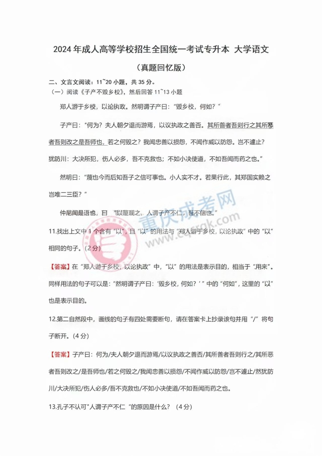 【導讀】2024年四川成考專升本大學語文考試結(jié)束了,很多同學都想知道自己考得如何,四川成考網(wǎng)特此整理了:2024年四川成人高考專升本《大學語文》真題及答案(考生回憶版)。